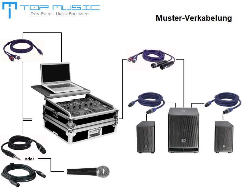 - Nun musst Du die Anlage noch verkabeln. Soweit es möglich ist, haben wir sämtliche Tonkabel beschriftet und bereits vorverkabelt. Jeder Kabelkoffer ist bei uns mit einer Packliste sowie einer bebilderten Musterverkabelung ausgestattet. Damit sollte die Verkabelung auf jeden Fall funktionieren. Ansonsten gibt es natürlich noch unseren telefonischen Support, der bei Fragen zur Verfügung steht.