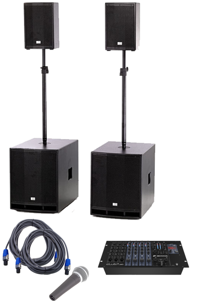 - Nun kommen die Topteile an die Reihe. Optimal platzierst Du diese links und rechts neben dem DJ-Set. Achte dabei darauf, dass Du die Lautsprecher nicht im spitzen Winkel zueinander aufstellst. Damit vermeidest Du einen schlechten Sound sowie Frequenzüberlagerungen, für den Fall, dass Du ein Mikrofon verwendest.