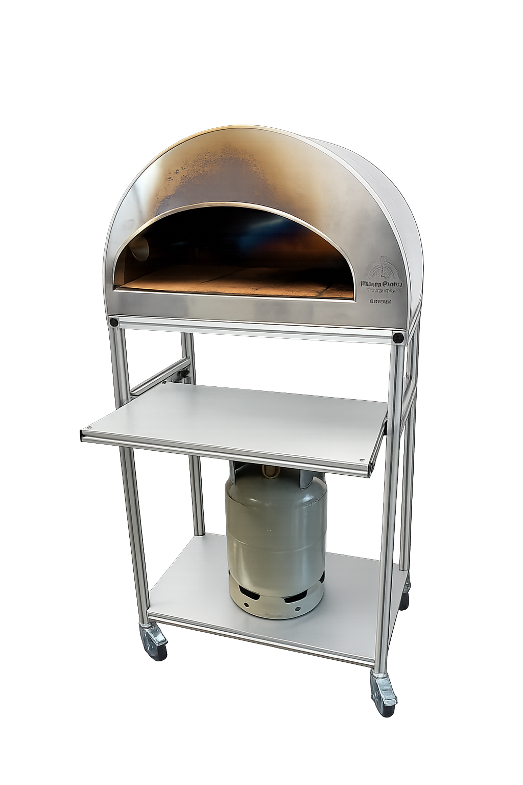 Hierbei werden die Standfüße des Pizzaofens demontiert und der Ofen direkt auf das Aluminiumgestell gesetzt. Die seitliche Überstand des Ofens fixiert diesen auf dem Aluminiumgestell und schützt vor Verrutschen.
